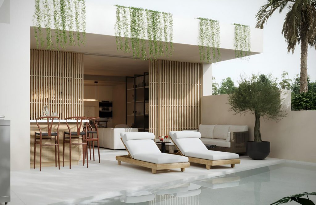 Outdoors, residents find a relaxation and entertainment oasis. The lounge area offers plush seating and panoramic views, perfect for al fresco gatherings or quiet moments. Adjacent, a meticulously designed bar with premium amenities provides an exclusive setting for cocktails against Ibiza’s sunsets. The outdoor kitchen features a pizza oven and grilling station for gourmet delights in the Mediterranean ambiance. It’s a testament to outdoor entertaining art.